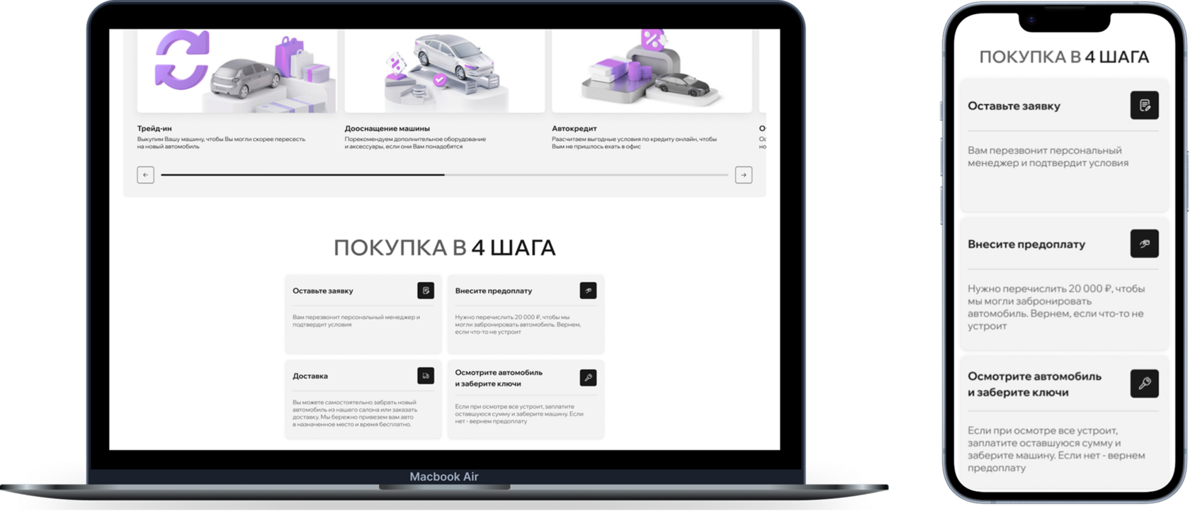 Покупка автомобиля онлайн — для большинства пользователей что‑то новое и непривычное. Моей задачей было упростить этот сценарий и сделать его понятным с первого экрана.